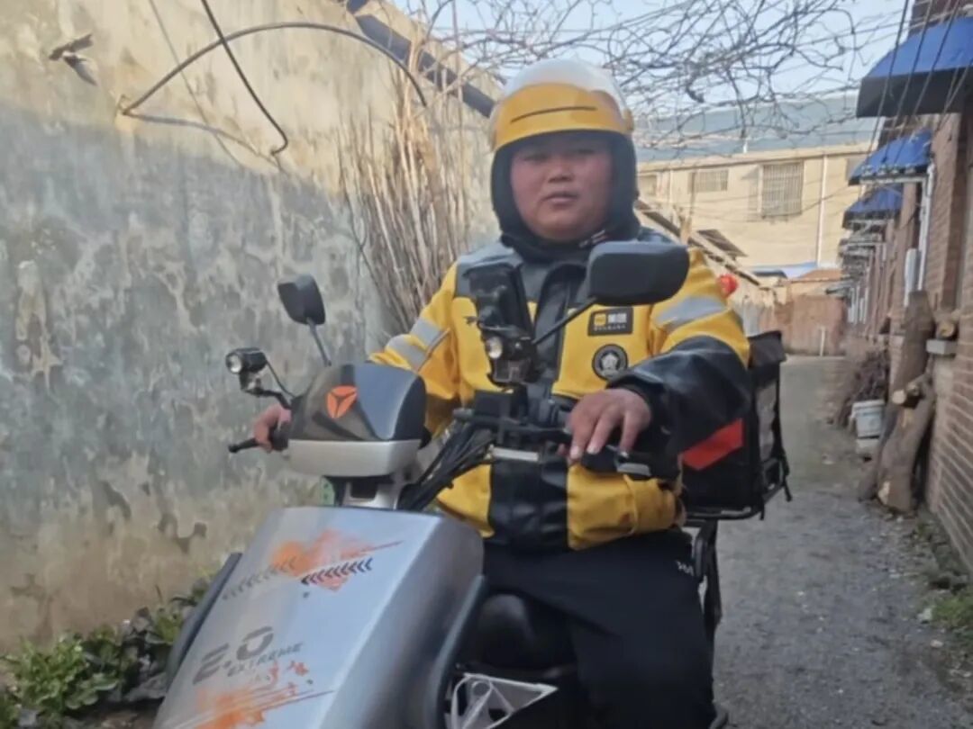 今年2月底,一个大哥随手给他拍了条18秒的视频,打上“镇上唯一的骑手”这一标签,一下子让他被看见了。“搜我这个话题的人达到了1.8亿之多,包括微博、微信,全平台都在报道。”